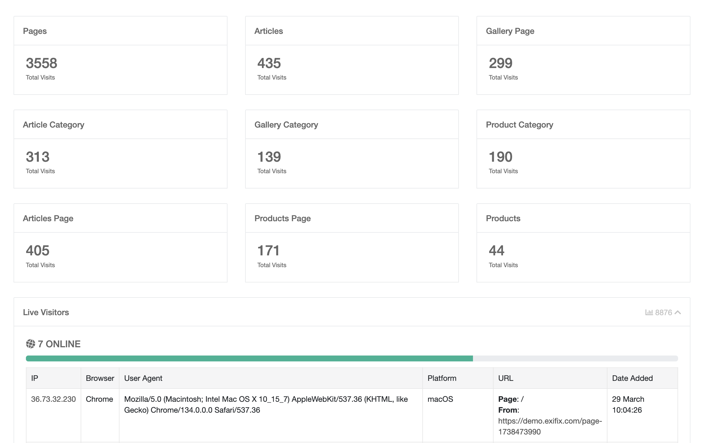 Exifix dilengkapi sistem pelacakan manual yang mencatat setiap halaman yang diakses, sambil secara cerdas mengecualikan bot crawler. Pengunjung unik diidentifikasi berdasarkan alamat IP mereka, memberikan wawasan yang akurat tentang interaksi pengguna sebenarnya—untuk analitik yang dapat diandalkan dan pengambilan keputusan berbasis data.
